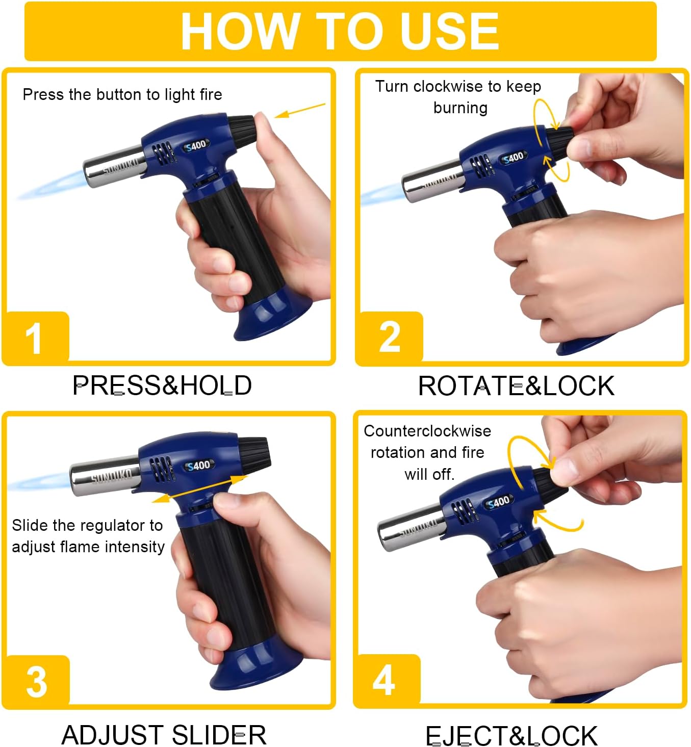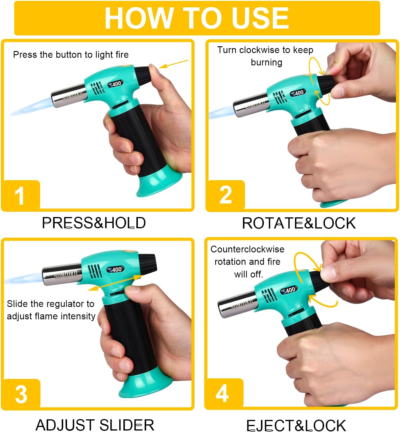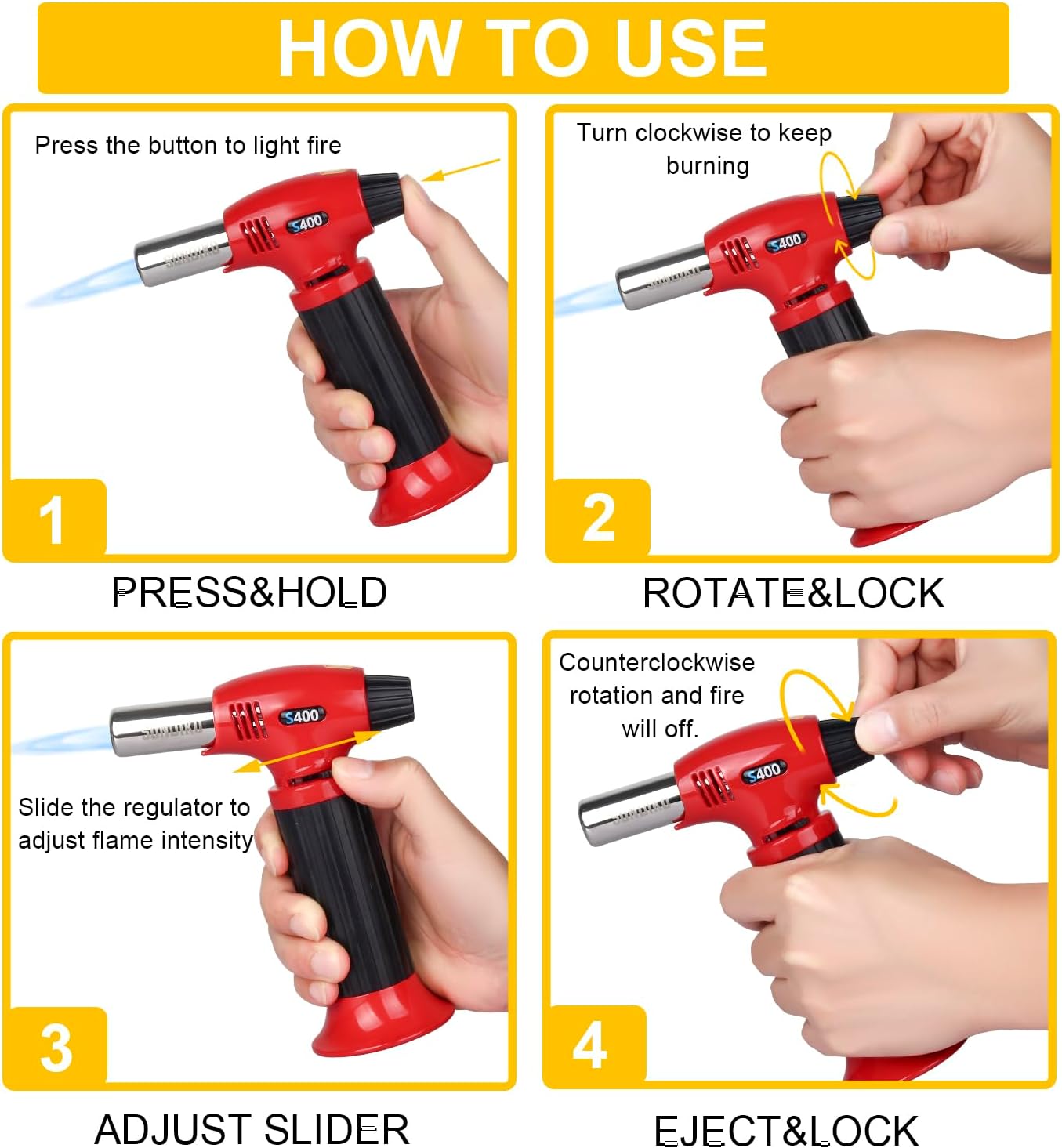 - ►Refillable and Easy to Operate: Refill the kitchen torch with any brand of butane. Please note that butane gas is not included. Simply slide the security lock to open, light up with Piezo Ignition Technology. It is a portable mini torch that you can take for many outdoor activities like camping and BBQ.