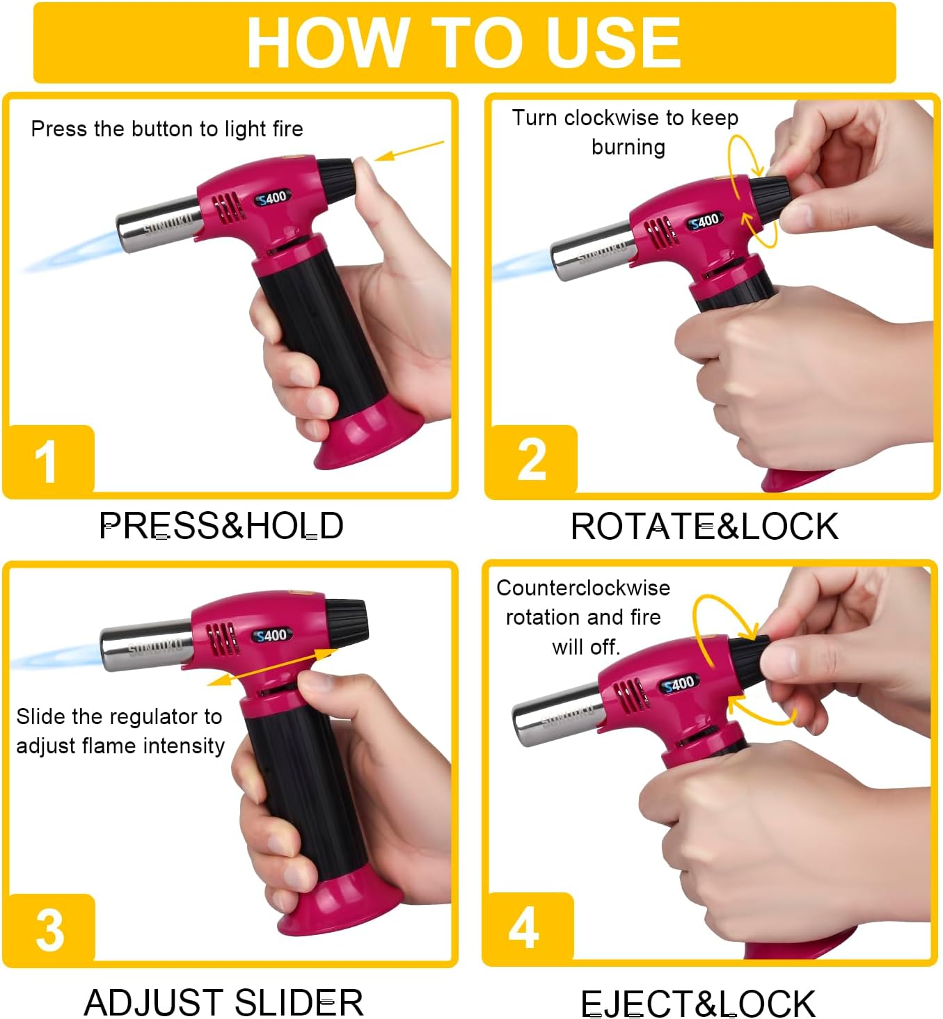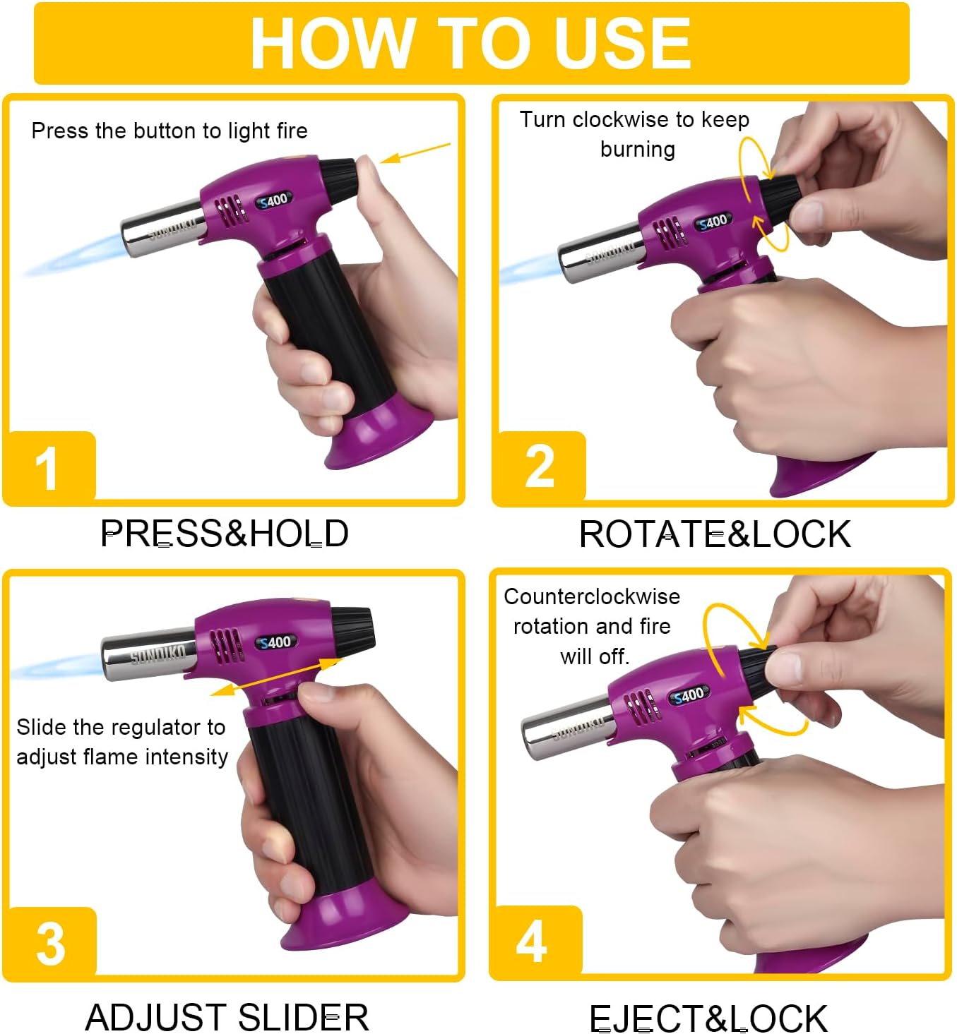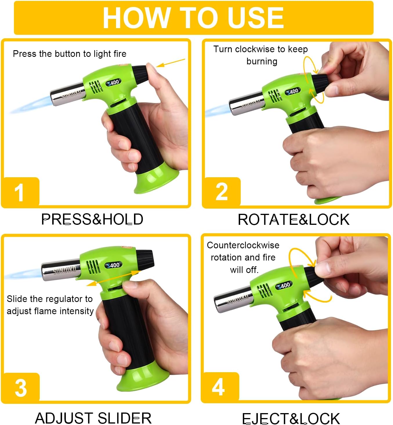 - ►Refillable and Easy to Operate: Refill the kitchen torch with any brand of butane. Please note that butane gas is not included. Simply slide the security lock to open, light up with Piezo Ignition Technology. It is a portable mini torch that you can take for many outdoor activities like camping and BBQ.