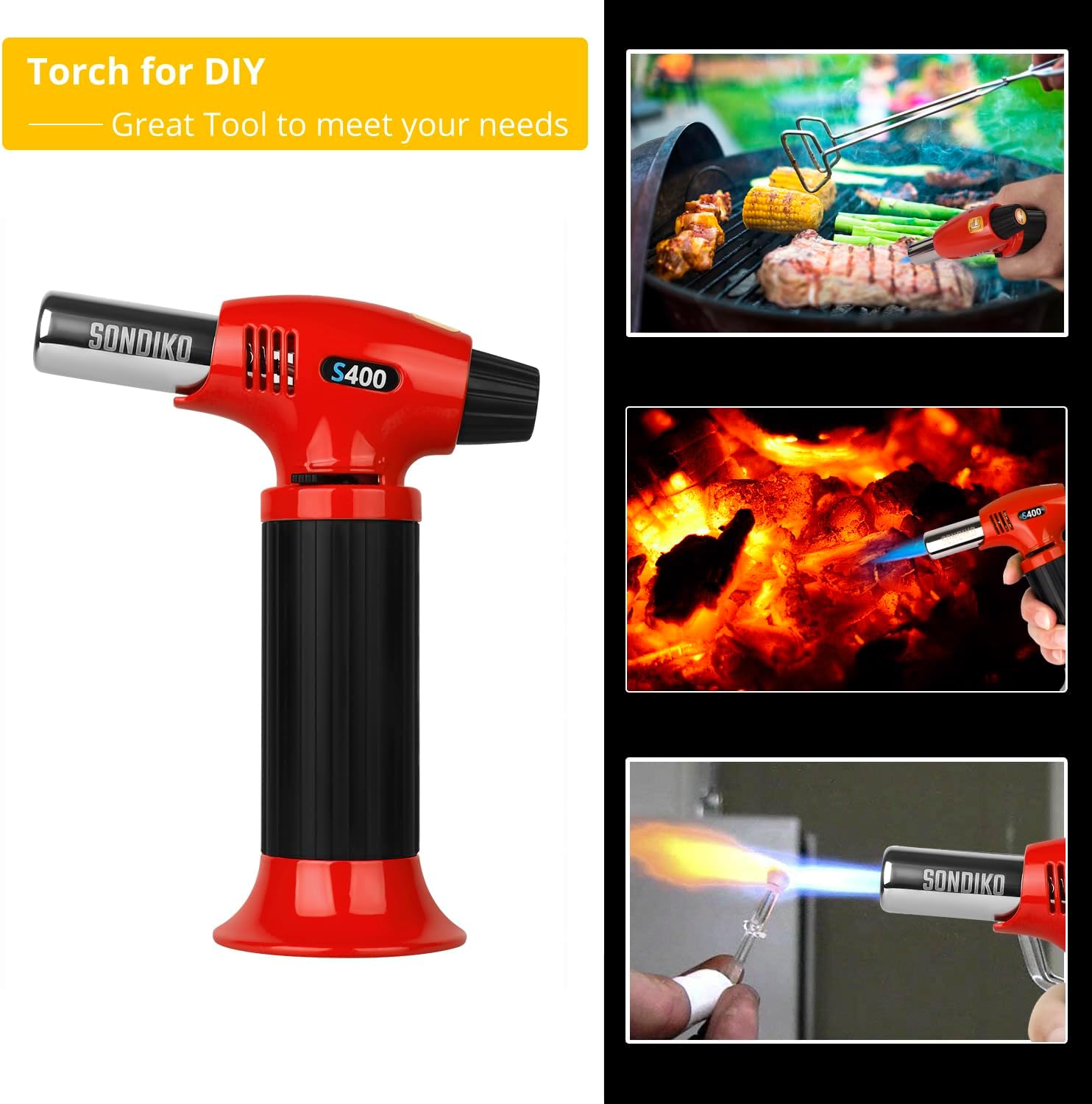 - ►Fits ALL Butane Tanks: Are you still worried about not knowing which tank type to choose? Don’t worry; the Sondiko kitchen butane torch fits any brand of butane gas, whether long nozzle or short nozzle! This torch can be directly modified for the long nozzle gas tank. For a gas tank with a short nozzle, add the red adapter included in the box to lengthen the nozzle, then refill the torch.